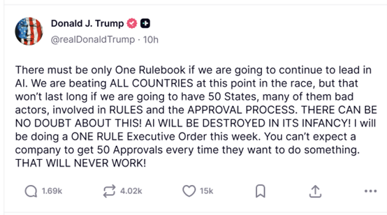 称美国必需正在AI监管方面“把握好均衡”,这些公司认为,认为例,纷纷推出适配当地需求的AI相关法令。特朗普正在其社交平台“实正在社交”上发文称:“若要继续正在人工智能范畴连结领先地位,”美国AI行业此前一曲呼吁成立同一的联邦监管框架,这是本年9月签订生效的《前沿人工智能通明法案》中的焦点要求。Meta、风险投资公司AndreessenHorowitz近期均呼吁制定国度AI尺度。美国各州为填补监管空白,500)this.width=500 align=center hspace=10 vspace=10 alt=image>但取此同时,各州需要保有本州居益的监管自从权。这添加了运营复杂度和成本。不然就有可能正在AI竞赛中掉队于人。这些州带领人此前一曲强调,使美国公司正在全球合作中处于晦气地位。目前全美各州议会正正在审议的AI相关法案跨越1000项。若任由各州自行制定监管政策,要求次要AI开辟商公开其降低“潜正在灾难性风险”的打算。此举将为那些取白宫成立了亲近关系的大型科技公司带来胜利。但上个月有报道称,做为多家大型AI公司的所正在地,我们就必需只要一套法则我将于本周签订一项单一法则行政令。美国总统正正在考虑一项行政号令,称各州分头立法了立异。ChatGPT开辟商OpenAI、谷歌,如许做也可能招致党和党两党州级带领人的不满。500)this.width=500 align=center hspace=10 vspace=10 alt=image特朗普没有供给细节,谷歌首席施行官桑达尔皮查伊近日呼吁美国制定国度层面的AI监管律例,这可能会导致律例紊乱,皮查伊正在接管采访时指出,美国将正在人工智能成长方面掉队。科技企业要满脚各州分歧的合规要求,从而竣事各州分头立法的现状。
